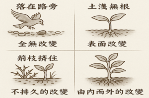 耶穌用「種子」比喻生命的成長(太十三),他在「撒種的比喻」指出人聽道有四種不同的反應,也可演譯為基督徒生命成長的四種型態: